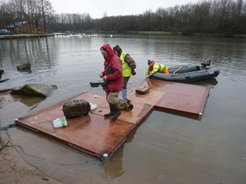 Close examination of bird Pontoons with the boat. 7 volunteers 14 volunteer hours